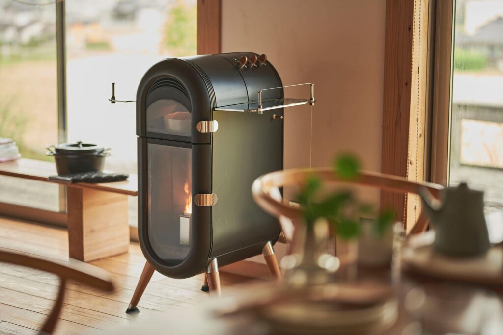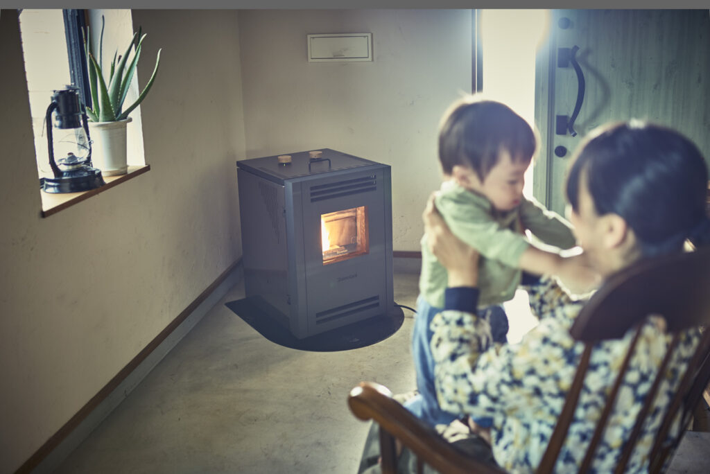 木材を細かく砕き、ぎゅっと圧縮して作られた木質ペレットを燃料とする、環境配慮型の暖房機器です。
